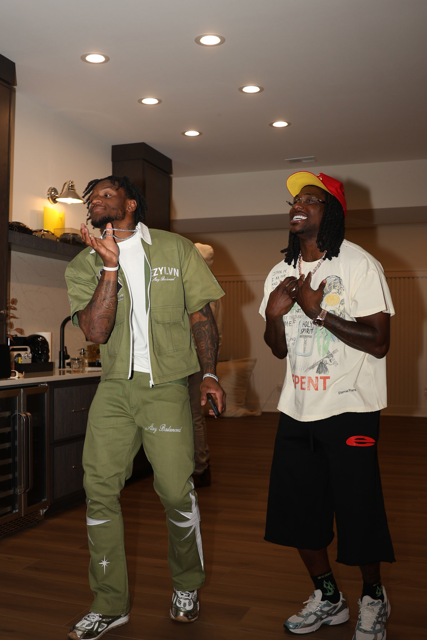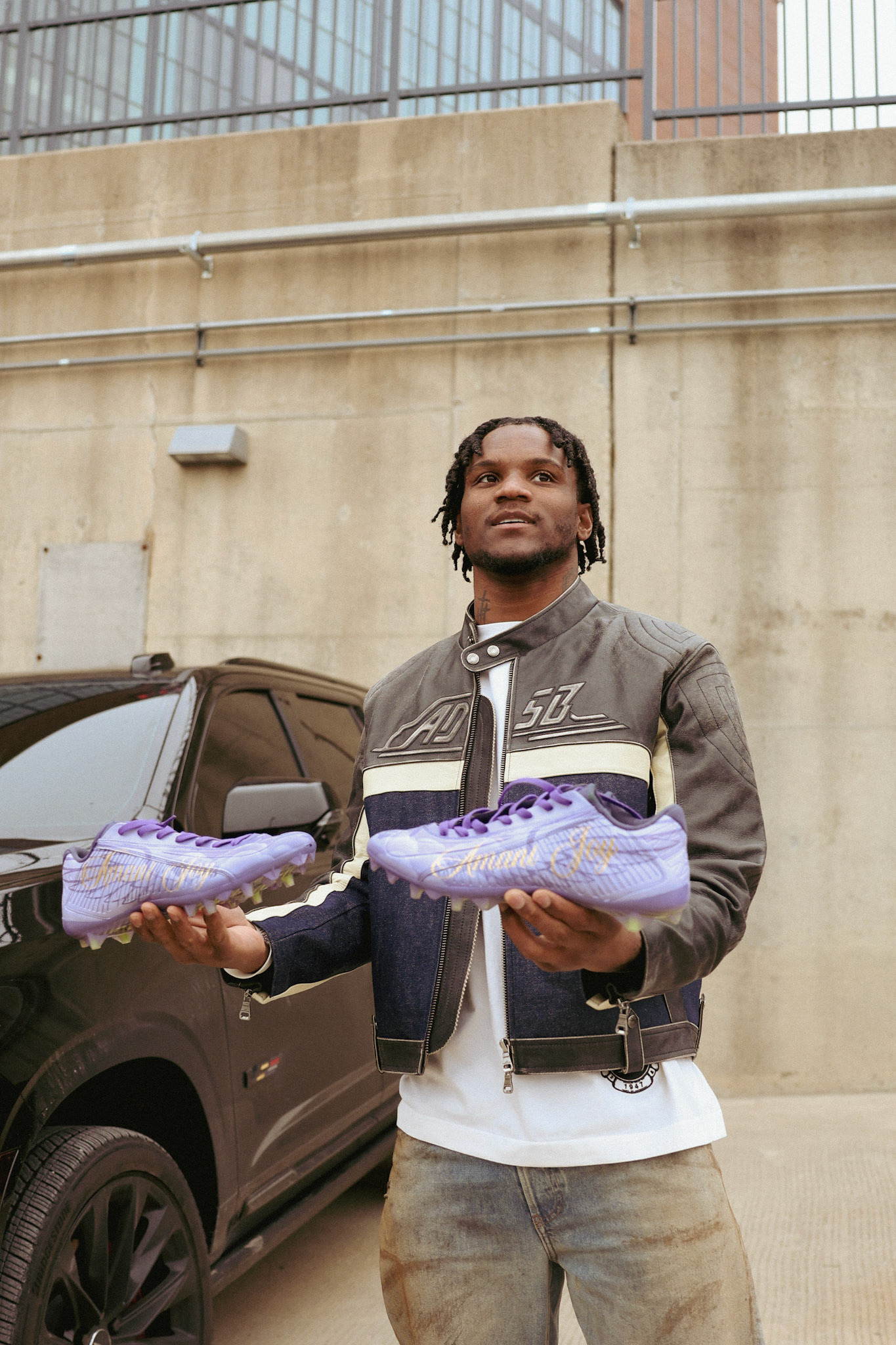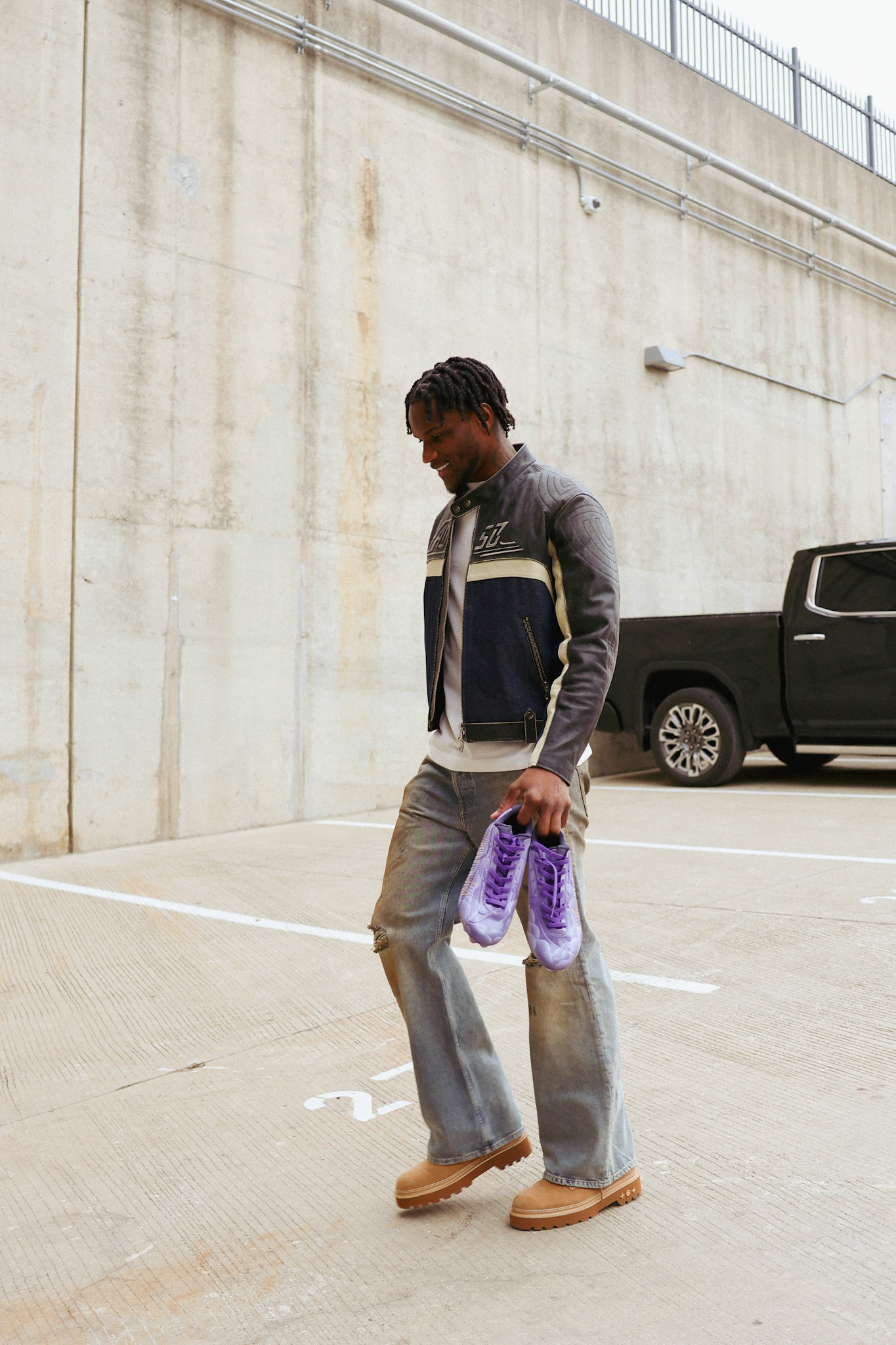One of the standout moments includes Ward holding a pair of purple sneakers. The color pops against the neutral background. It introduces personality without overwhelming the look. These detail shots add depth to the charvarius ward gameday outfit colts concept by showing layers beyond the clothing itself.