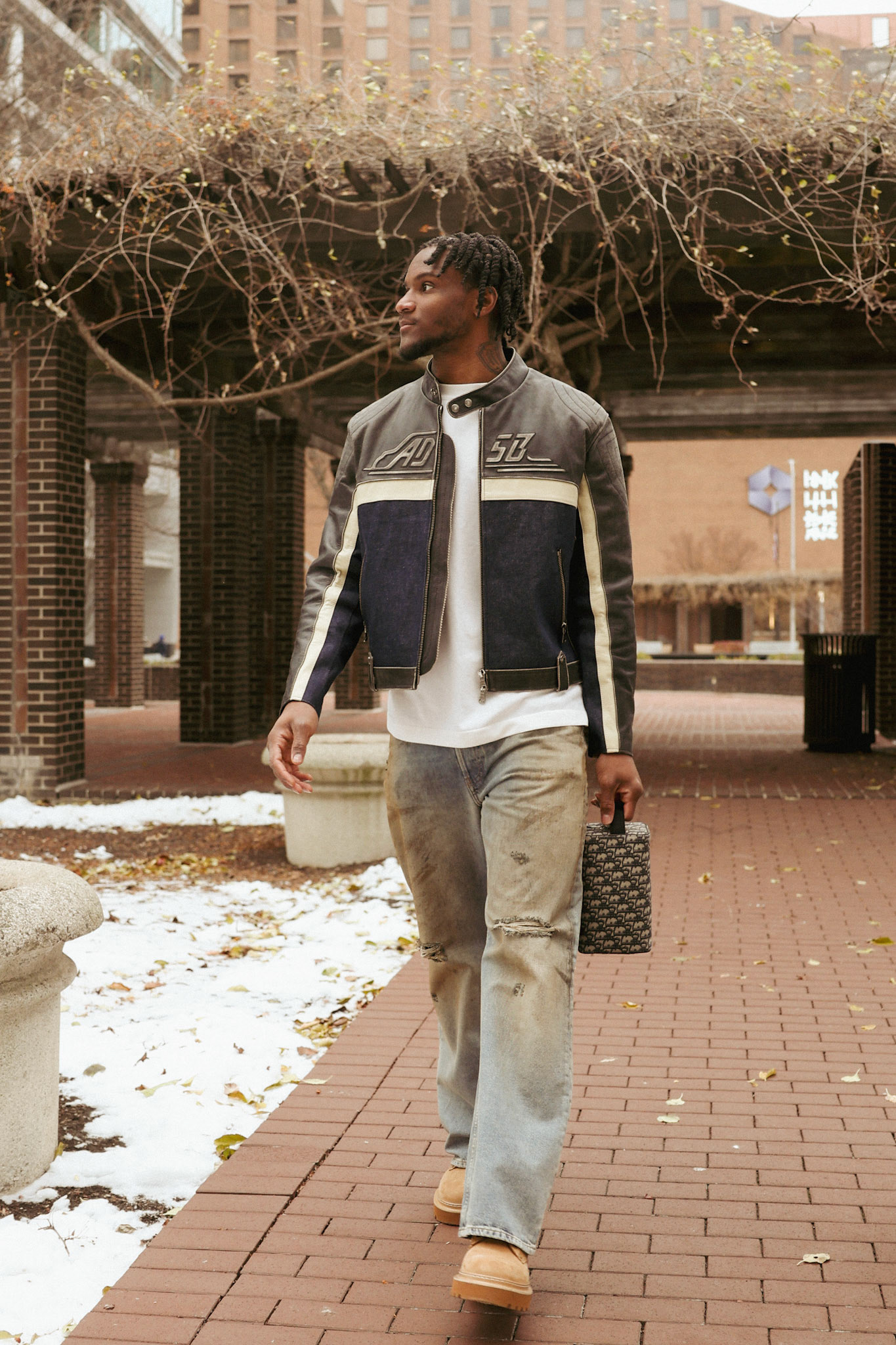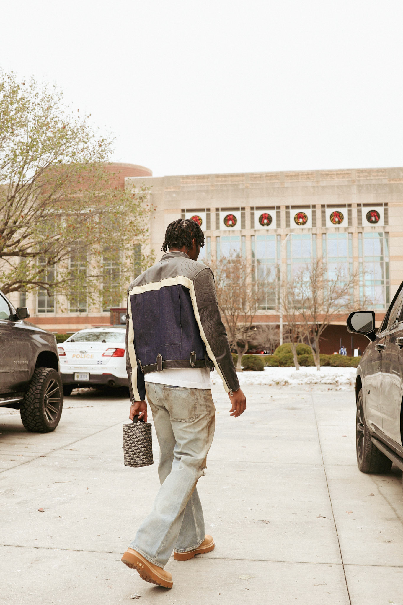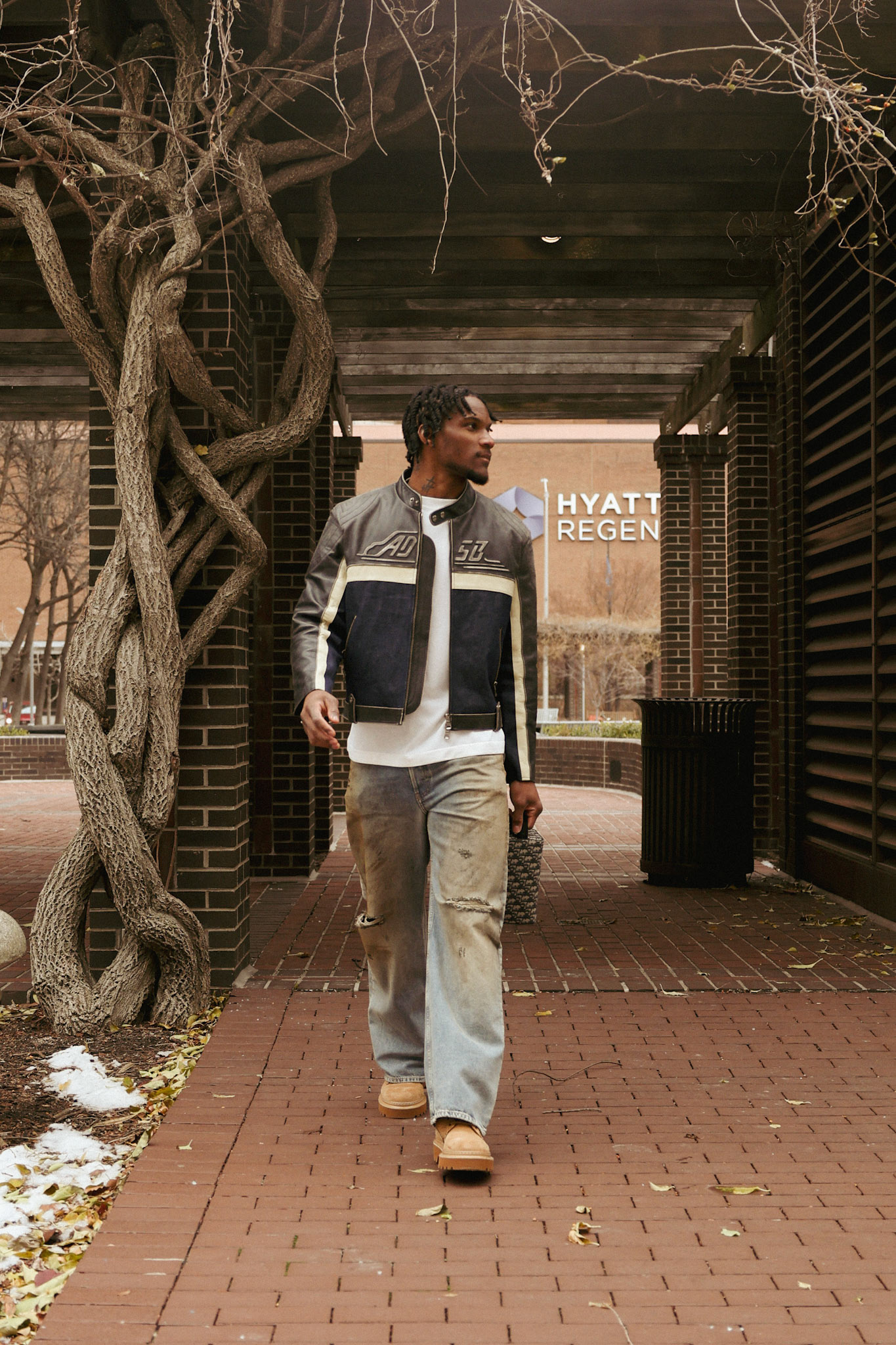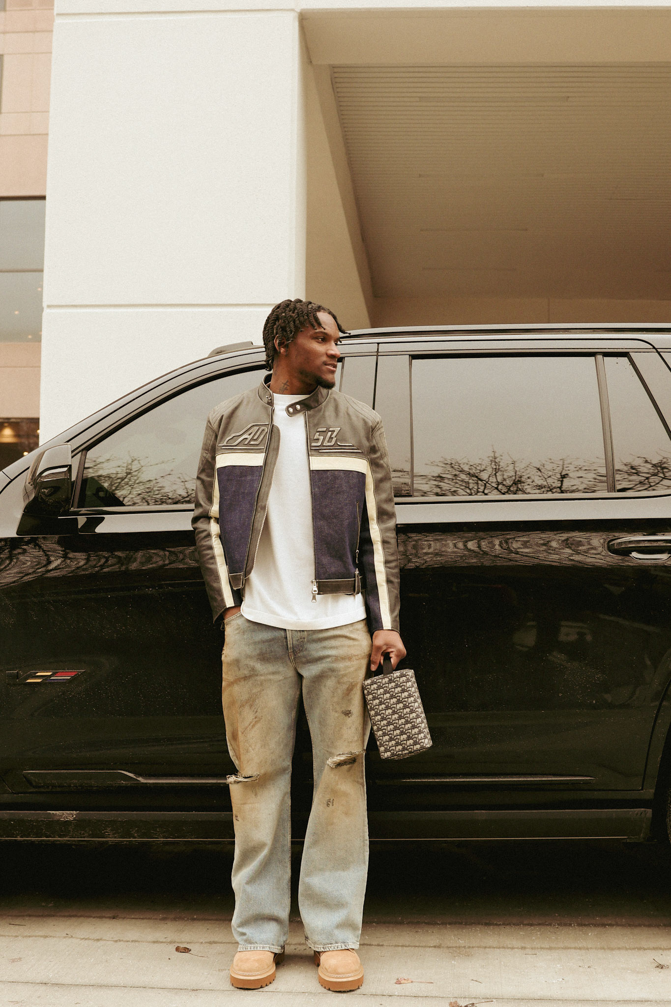The charvarius ward gameday outfit colts story begins with Ward stepping into the city with calm focus. The setting feels quiet but intentional. The brick walkway, the winter vines overhead, and the neutral tones of the buildings all frame him naturally. His outfit feels effortless yet structured. Worn denim, layered outerwear, clean footwear, and a compact designer bag complete a look that blends comfort with authority.