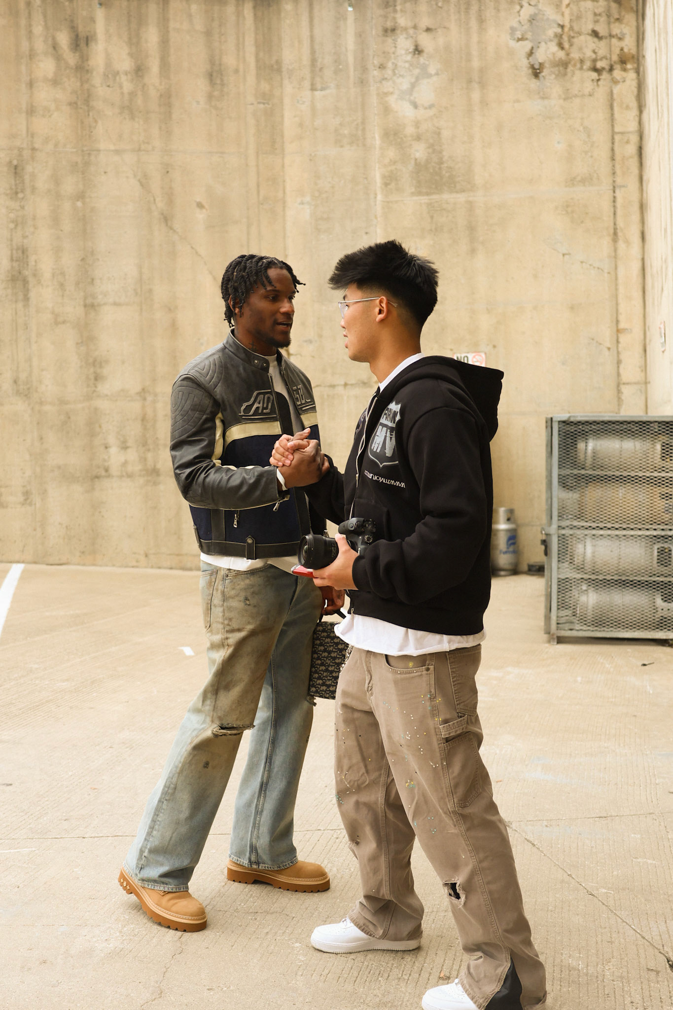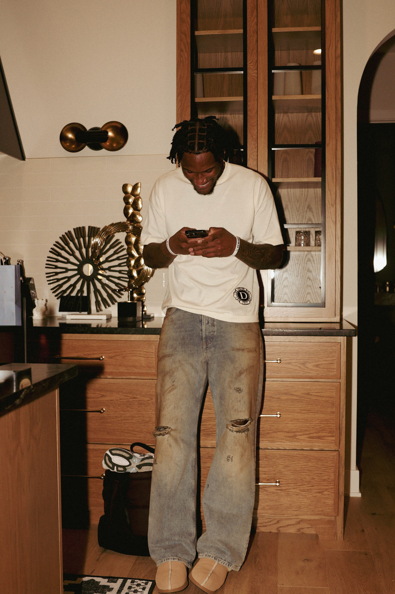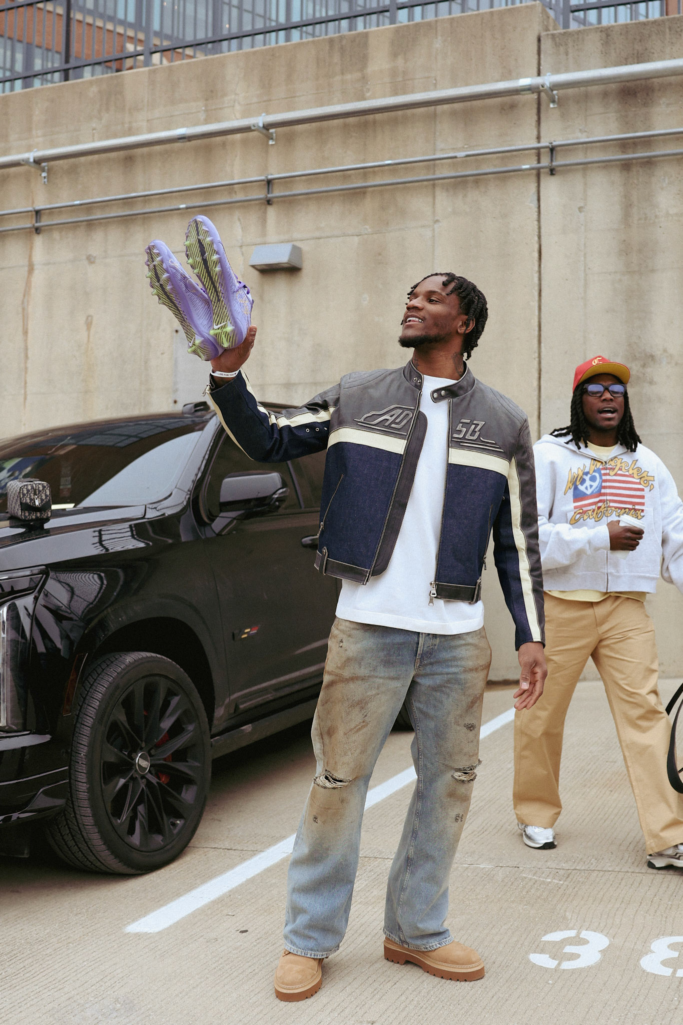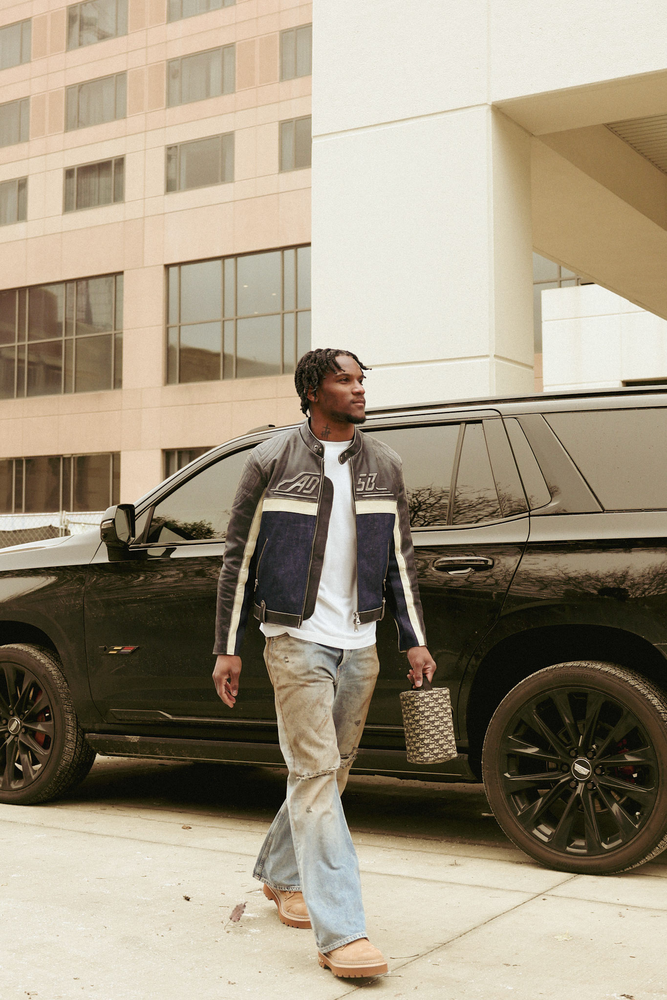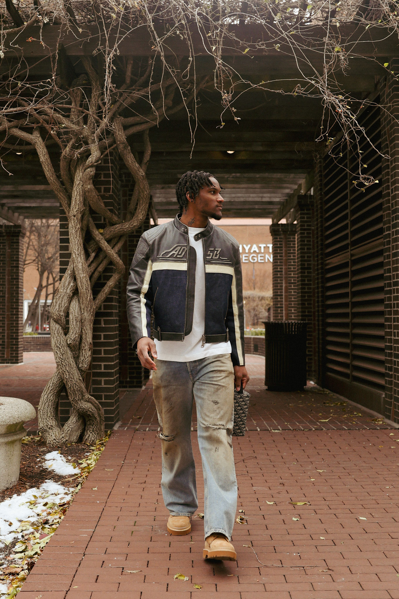 The charvarius ward gameday outfit colts story begins with Ward stepping into the city with calm focus. The setting feels quiet but intentional. The brick walkway, the winter vines overhead, and the neutral tones of the buildings all frame him naturally. His outfit feels effortless yet structured. Worn denim, layered outerwear, clean footwear, and a compact designer bag complete a look that blends comfort with authority.