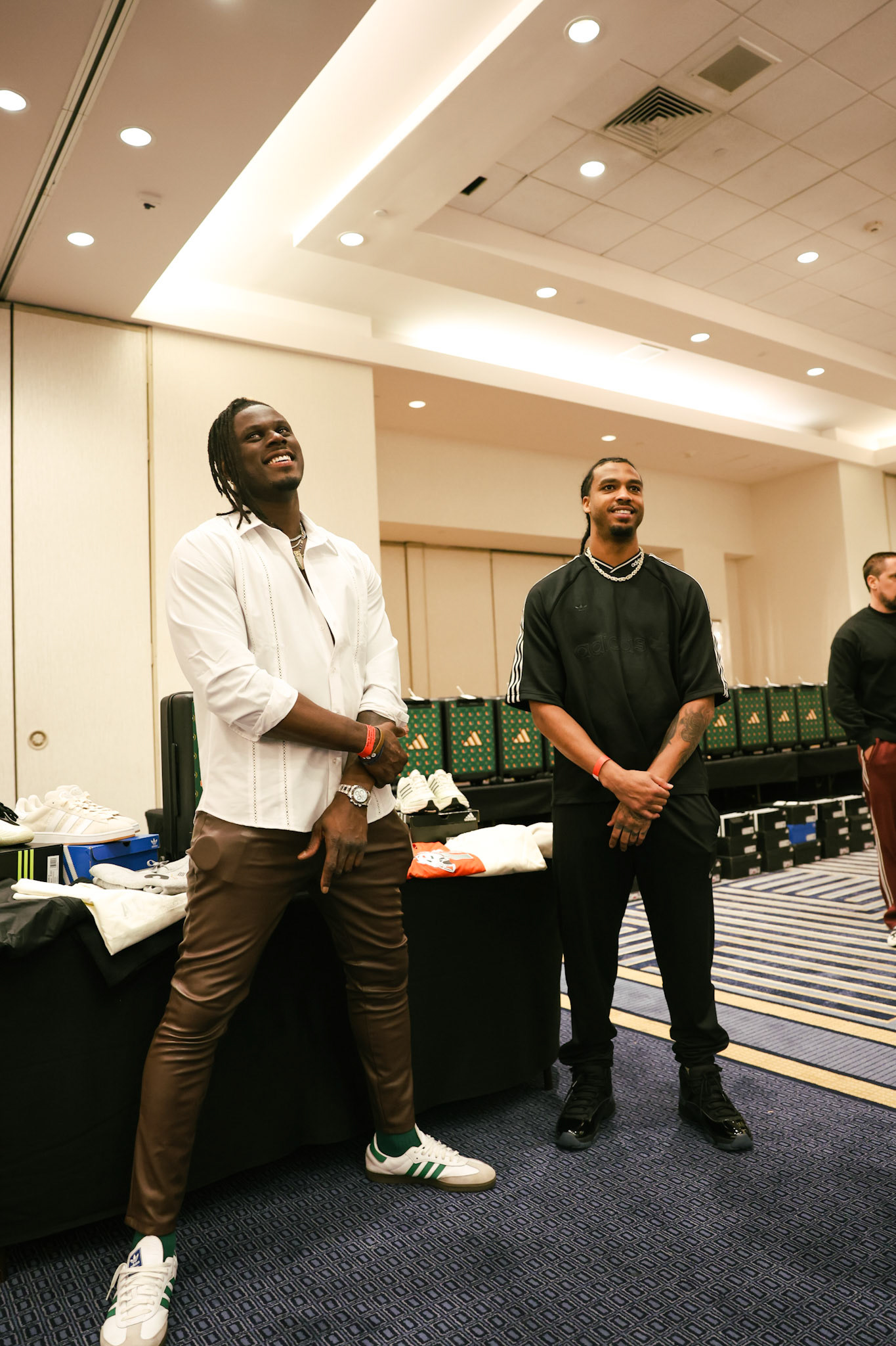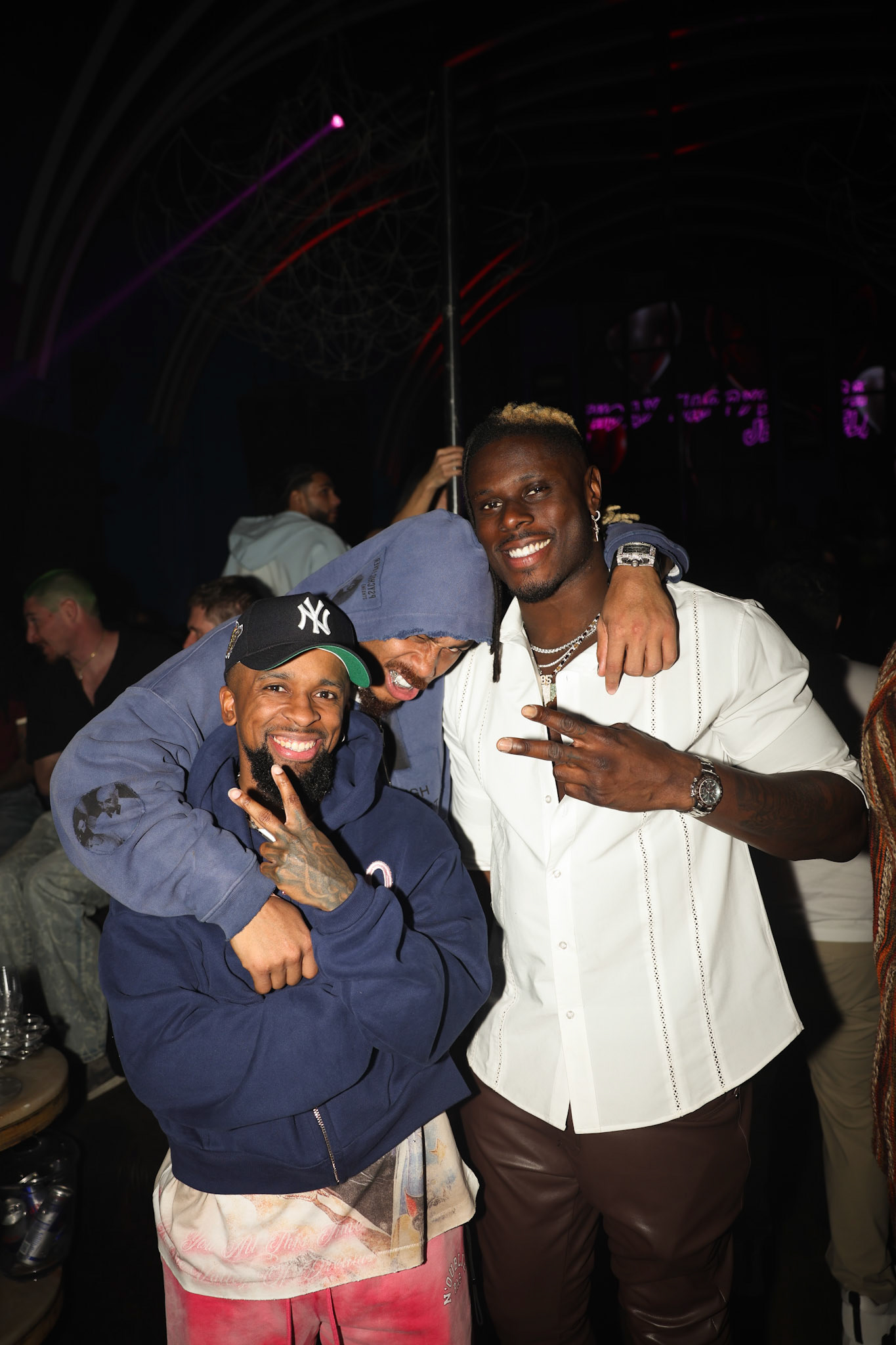 Another important part of these David Njoku Miami trip is the people around him. Teammates and close friends stand beside him inside the ballroom, flashing subtle hand signs and smiling toward the lens. Later, in a club setting, he wraps an arm around a friend, laughing with genuine ease. The lighting shifts to deep blues and purples, reflecting off faces and clothing, adding depth to the moment. Njoku’s personality comes through clearly here. On the field, he is powerful and intense. In these frames, he is open, grounded, and connected to his circle. The images tell a story of loyalty and shared experiences, something that mirrors the teamwork required in professional football.