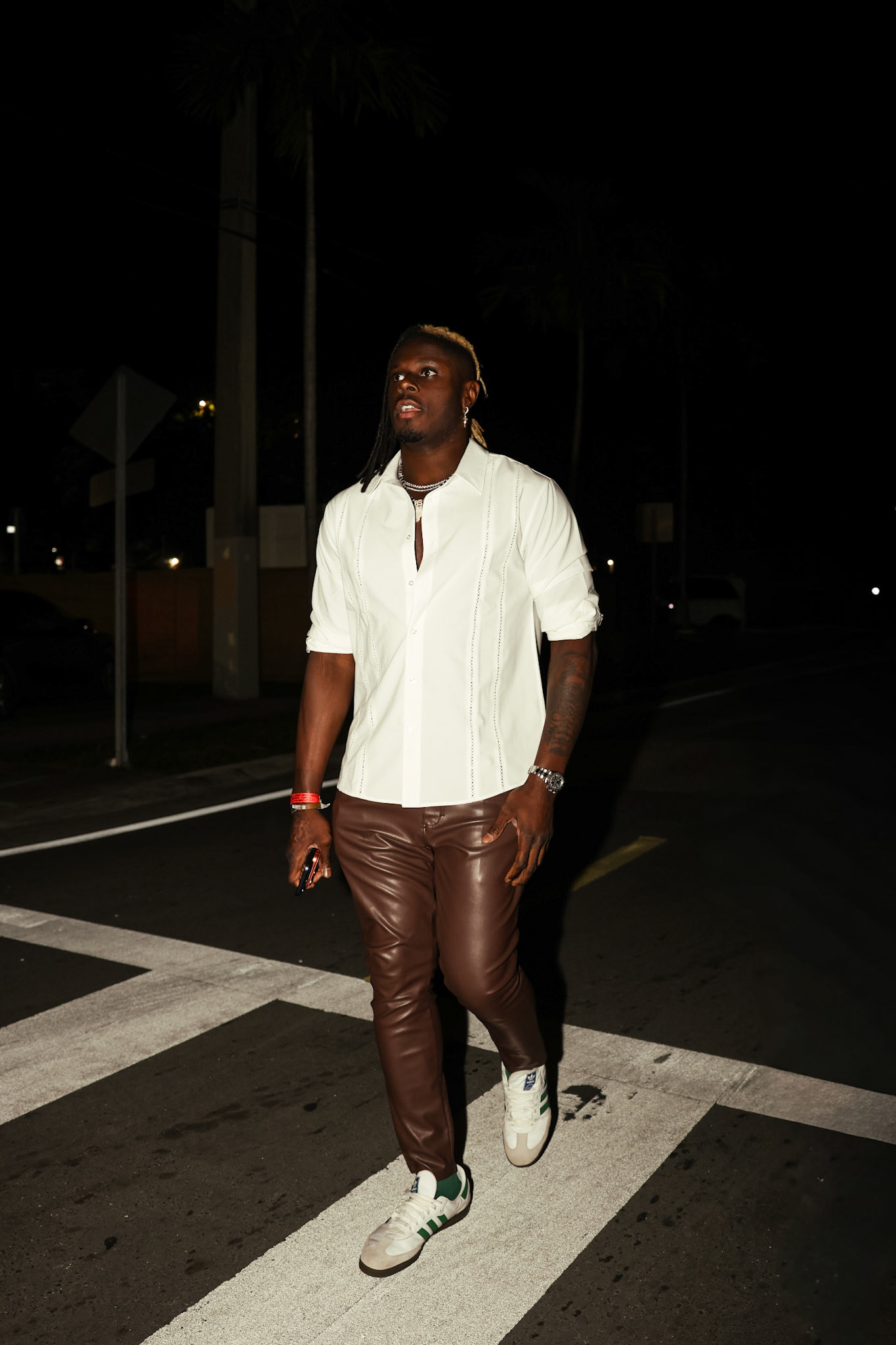 One of the strongest elements of this David Njoku Miami trip is how naturally his personal style aligns with the environment. The white shirt contrasts sharply against the darker night scenes, making him stand out whether indoors under warm lighting or stepping onto a dimly lit street. The leather pants bring edge without trying too hard, and the sneakers ground the outfit in comfort and movement. In one frame, he steps across a Miami crosswalk under streetlights, shoulders back, eyes forward. The city around him fades into shadow while he remains sharply defined. It is not staged energy. It is the kind of presence that comes from someone comfortable in his own space, whether that space is a packed stadium or a late night Miami street.
